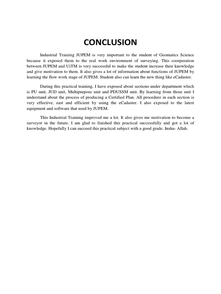 Conclusion for report industrial training As a student of Politeknik Balik Pulau I have to undergo the industrial training for four month from 1st December 2015 to 17th May 2013. Up to 24 cash back CONCLUSION. Organization of information industrial training activities and conclusion.